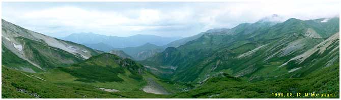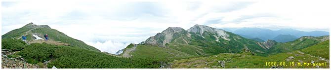 左が白馬岳、中央の平らなのが杓子岳、その右が白馬鑓ヶ岳です