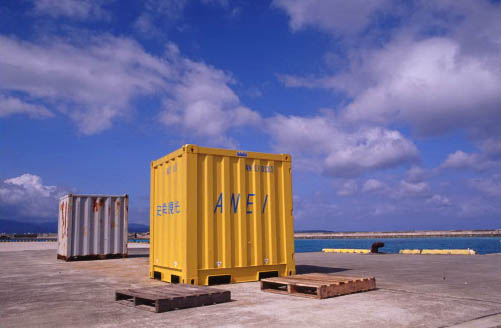 船着場の発色鮮やかな船会社のコンテナ 旅客ターミナルが完成するまでは 日差しや雨をよける場として利用されていたという