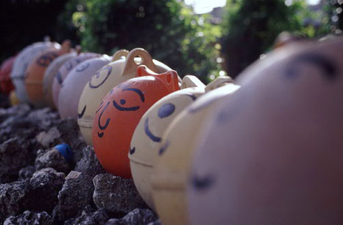 のんびり集落を散策 サンゴの石垣に並んだ浮き球の表情は豊か