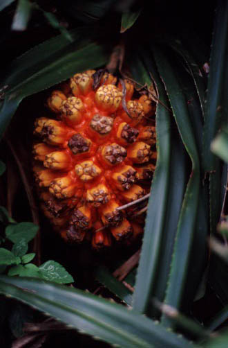 いいころあいに熟してきたアダンの実 これもヤシガニのご馳走になるのだろうか