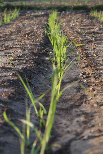 サトウキビの苗が朝の斜光に浮かび上がる