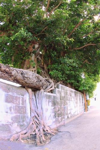 2年ぶりの沖縄は夏真っ盛り 塀の間に根を張るガジュマルに目を奪われる 「樹齢200年だってさ。有名な木だよ」と通り掛かりの人