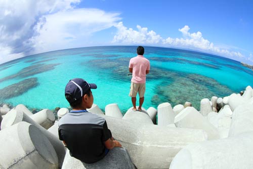 いつもの島に着いて防波堤を散策 祭りで帰省した親子はイカ狙い