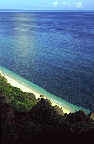 東崎付近の崖のふもとにあるビーチ 真っ白な砂とリーフのコントラストに惹かれた
