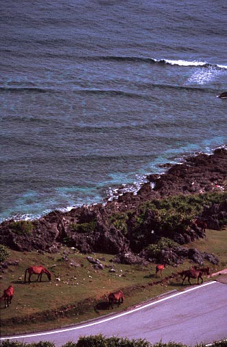 東崎を下った海岸にも与那国馬 親子は必ず3頭連れで歩いていた