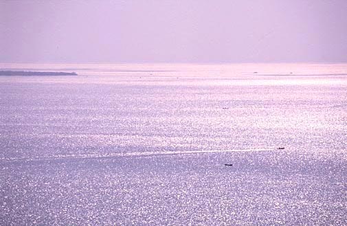 大岳(ウフダキ)から見下ろす八重山の海 逆光の下で本来の色彩をひそめる かすみも手伝い瀬戸内のような姿をみせた