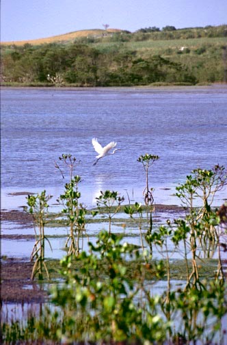 静寂に波紋をたてるように白鷺が羽ばたく 対岸の丘には、ちゅらさんで重要な意味をもった「和也の木」が立つ