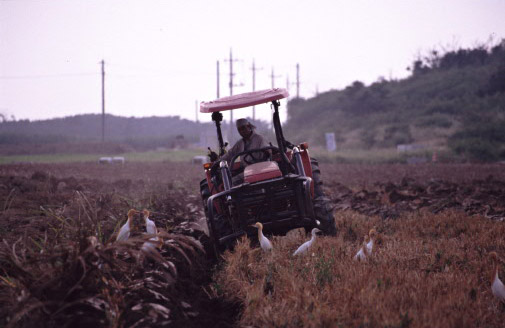 トラクターが畑を耕し始めると集まる鳥たち 「掘り起こした後に出る虫を狙っているのさ」と畑の主 「人なんかぜんぜん怖がらないよ。頭が黄色いのはまだ子どもらしいよ」